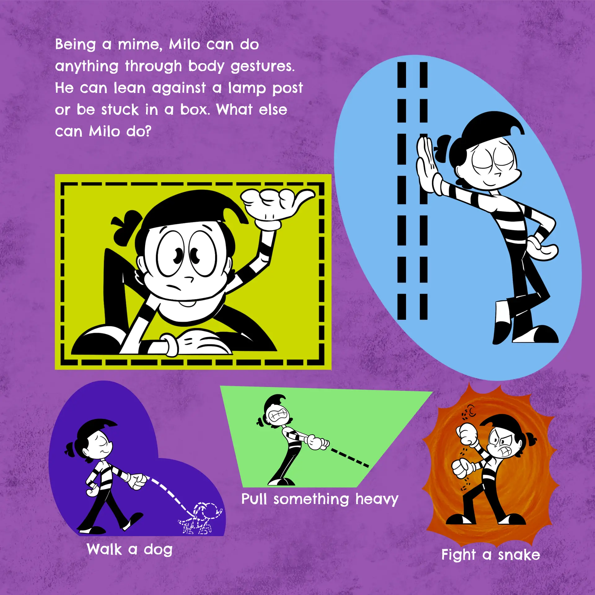 The book follows Milo, a mime who is unable to use words to express himself. As he goes through his adventures, children will learn how Milo stands up for his quirks and uses them to contribute uniquely to his community.  His story provides a fun and earnest role model for those of us who live with communication challenges.